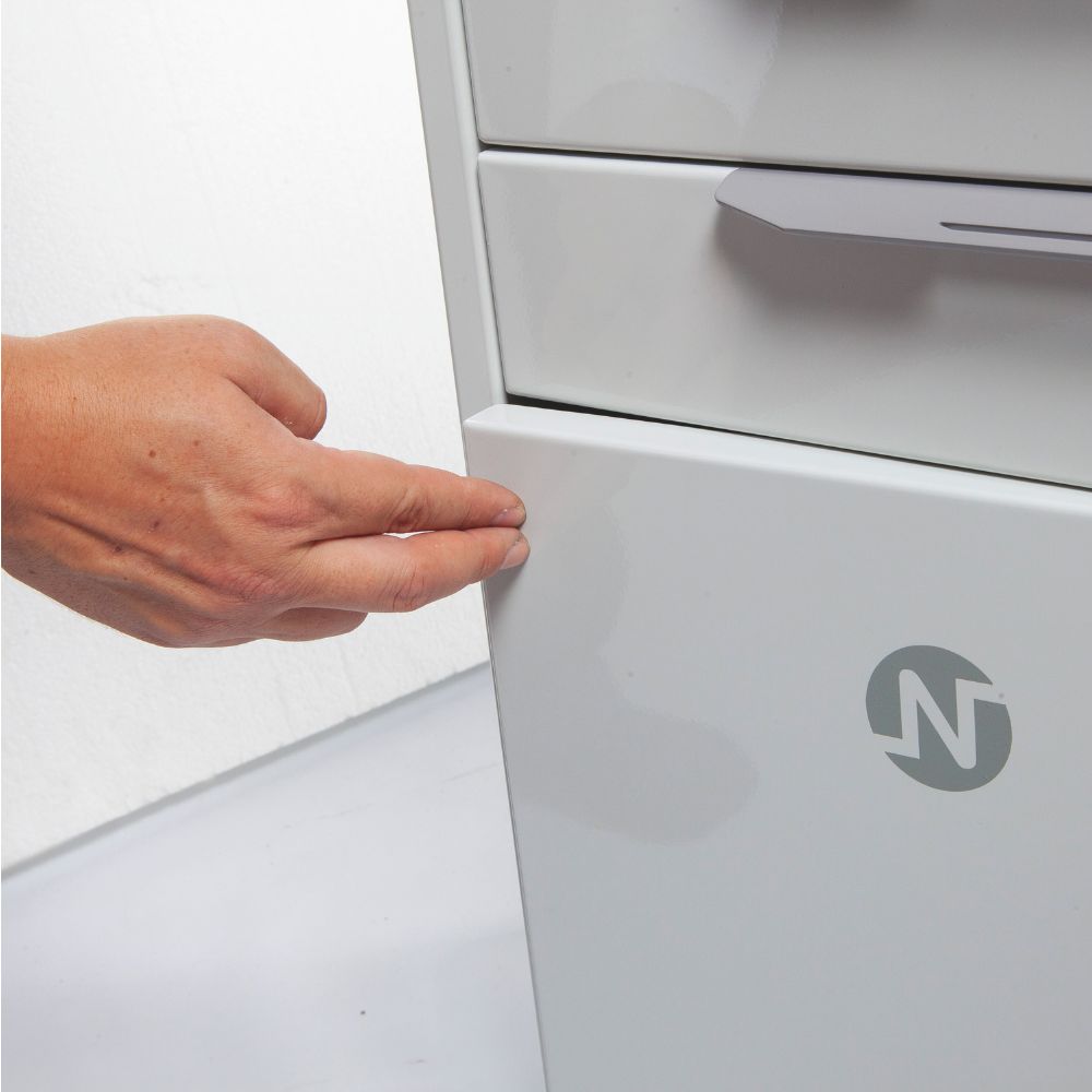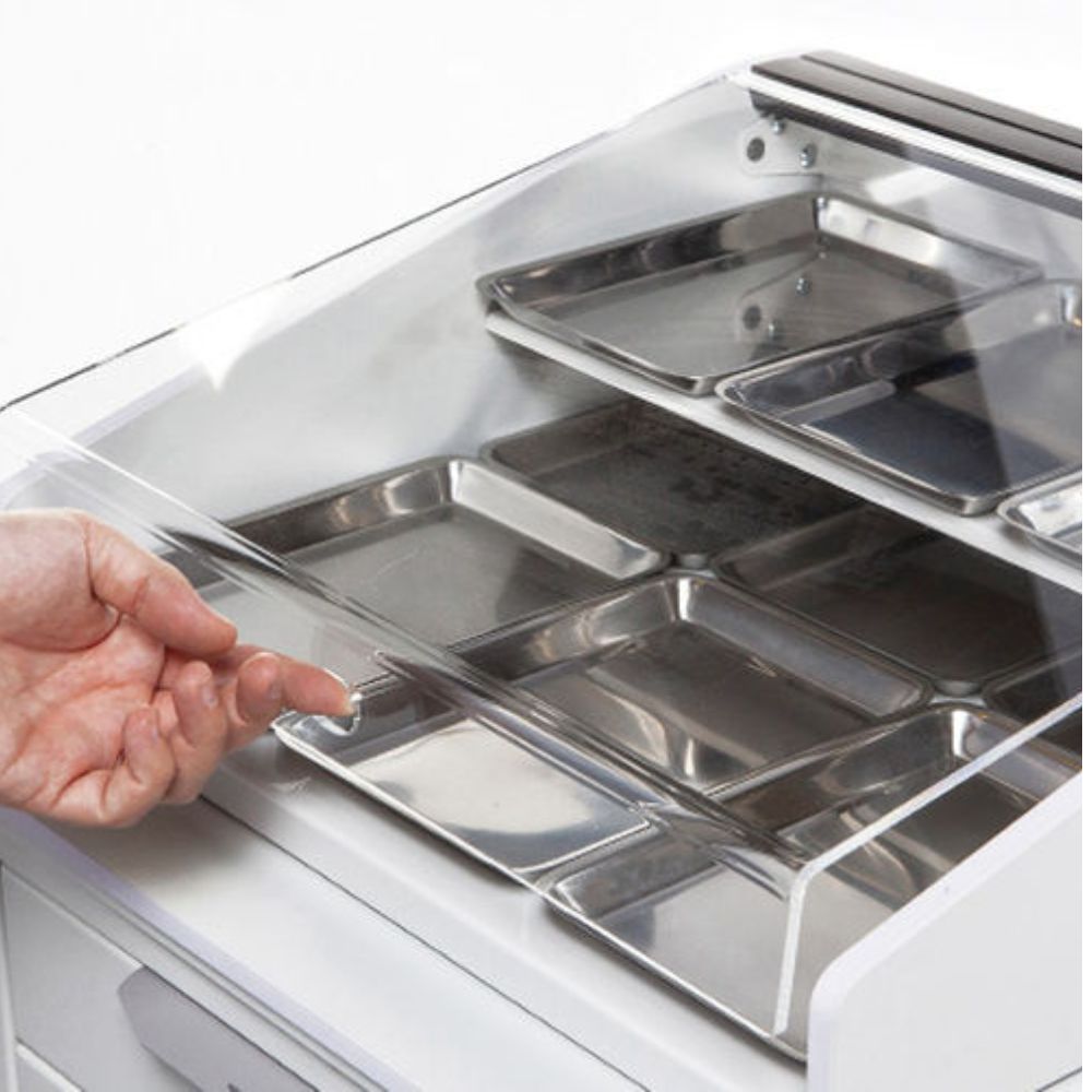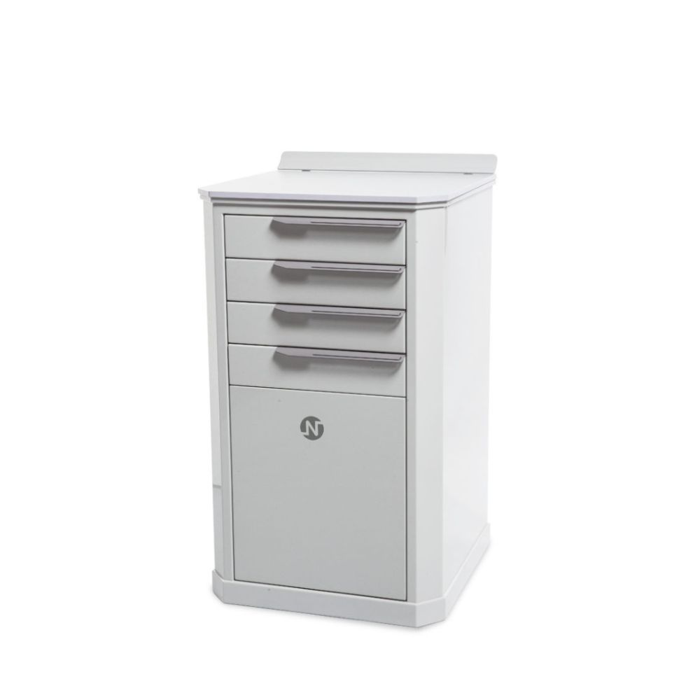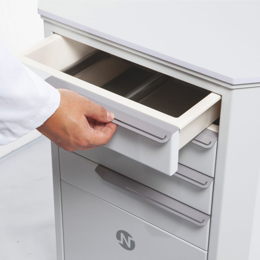 Moduł OTONAM 100 wyposażony jest w cztery samo-domykające się szuflady oraz dużą wnękę zamykaną drzwiczkami. Opcjonalnie, na blacie modułu można ustawić 2-poziomową, zamykaną pokrywą nadstawkę z tackami na instrumentarium.